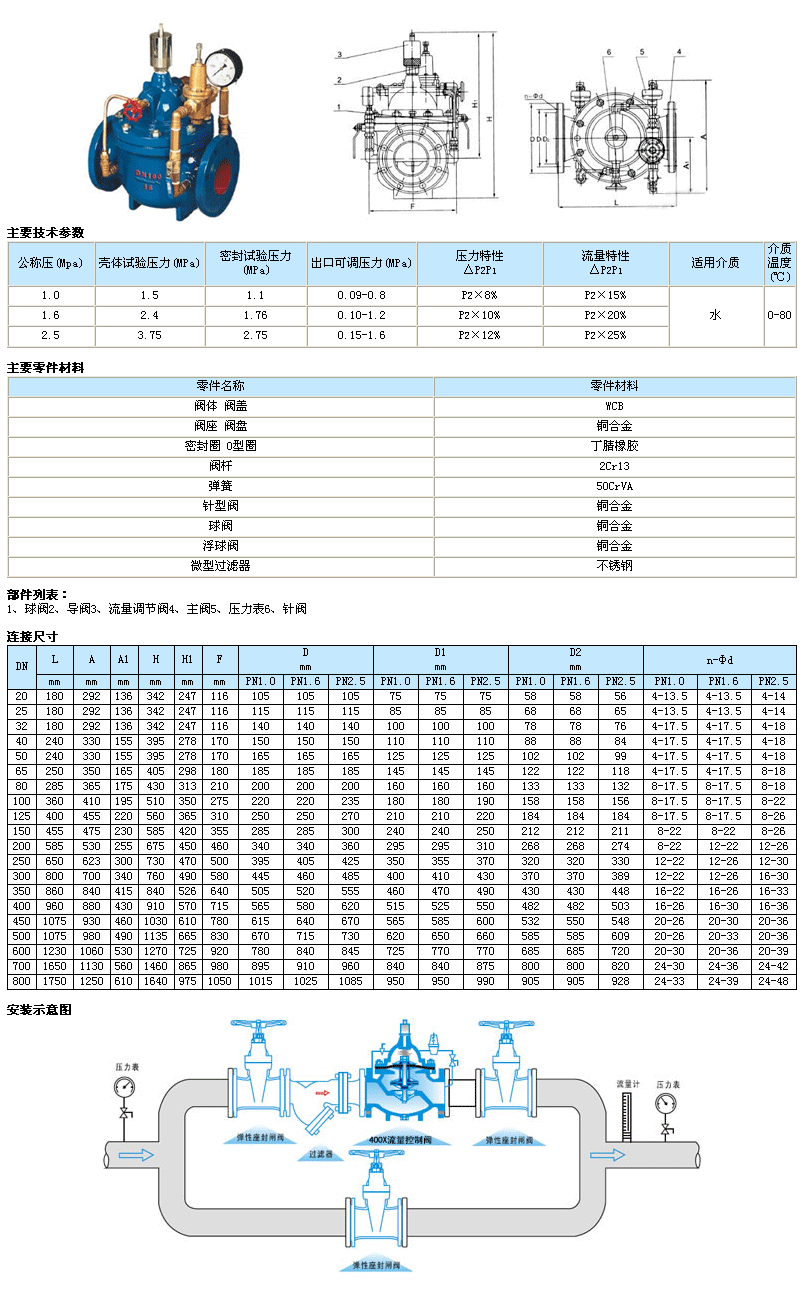 400X流量控制閥由主閥、流量調(diào)節(jié)閥、針閥、導(dǎo)閥、球閥、微形過濾器和壓力表組成水力控制接管系統(tǒng)。利用水力自動操作,控制和調(diào)節(jié)主閥開度,使通過主閥的流量保持不變。本產(chǎn)品利用水力自力控制,不需要其它裝置和能源,保養(yǎng)簡便,流量控制穩(wěn)定。本系列閥門產(chǎn)品廣泛用于高層建筑、生活區(qū)等供水管網(wǎng)系統(tǒng)及城市供水工程。當(dāng)閥門從進(jìn)口端給水時,水流過針閥進(jìn)入主閥控制室,并經(jīng)過導(dǎo)閥、球閥流出主閥控制室到出口,此時主閥處于全開或浮動狀態(tài)。調(diào)定主閥上部的流量調(diào)節(jié)閥,可為主閥設(shè)定一定開度。調(diào)節(jié)針閥開度和調(diào)節(jié)導(dǎo)閥彈簧壓力,即可使主閥開度保持在設(shè)定開度,并在壓力變化時導(dǎo)閥進(jìn)行自動調(diào)節(jié),保持流量不變。