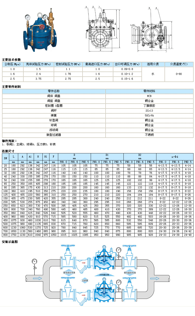 200X減壓穩(wěn)壓閥由主閥、導(dǎo)閥、針閥、球閥、微型過濾器和壓力表組成水力控制接管系統(tǒng)。使用時(shí),當(dāng)調(diào)定出口壓力后,能自動(dòng)保持穩(wěn)定出口壓力。本產(chǎn)品利用導(dǎo)閥自力控制,不需要其它裝置和能源,保養(yǎng)簡便,壓力控制準(zhǔn)確度高,受進(jìn)口壓力和流量影響小,減壓穩(wěn)壓可靠。本系列閥門產(chǎn)品廣泛用于高層建筑、生活區(qū)等供水管網(wǎng)系統(tǒng)及城市供水工程。當(dāng)閥門從進(jìn)口端給水時(shí),水流過針閥進(jìn)入主閥控制室,出口壓力通過導(dǎo)管作用到導(dǎo)閥上。當(dāng)出口壓力高于導(dǎo)閥彈簧設(shè)定值時(shí),導(dǎo)閥關(guān)閉。控制室停止排水,此時(shí)主閥控制室內(nèi)壓力升高并關(guān)閉主閥,出口壓力不再升高。當(dāng)閥門出口壓力降到導(dǎo)閥彈簧設(shè)定壓力時(shí),導(dǎo)閥開啟,控制室向下游排水。由于導(dǎo)閥系統(tǒng)排水量大于針閥的進(jìn)水量,主閥控制室壓力下降。進(jìn)口壓力使主閥開啟。在穩(wěn)定狀態(tài)下,控制室進(jìn)水、排水相同,主閥開度不變,出口壓力穩(wěn)定。調(diào)節(jié)導(dǎo)閥彈簧即可設(shè)定出口壓力。 |