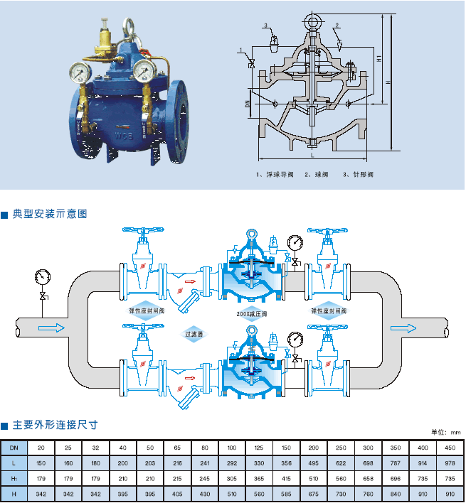 200X減壓閥是一種利用介質自身能量了調節與控制管路壓力的智能型閥門。用于生活給水、消防給水及其他工業給水系統,通過調節減壓導閥,即可調節主閥的出口壓力。出口壓力不因進口壓力、進口流量的變化而變化,安全可靠地將出口壓力維持在設定直上,并可根據需要調節設定直以達到減壓目的。該閥減壓精確,性能穩定、安全可靠、安裝調節方便,使用壽命長。