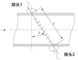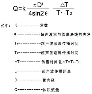 當超聲波在液體中傳播時,探頭1發射的超聲波脈沖被探頭2所接收,同時,探頭2也發射超聲脈沖,探頭1接收,則順流方向聲波傳播速度會增大,逆流方向則減小,同一傳播距離就有不同的傳播時間,利用傳播時間之差與被測流速之關系求取流速,進而得出流量,其關系式如下: