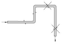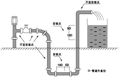 ● 應安裝在水平管道較低處和垂直向上處,避免安裝在管道的高點和垂直向下處
