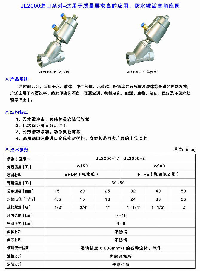 JL2000進口系列雙作用角座閥是我公司的優質產品之一,在上海JL2000進口系列雙作用角座閥廠家中享有極高的品質聲譽與服務評價.