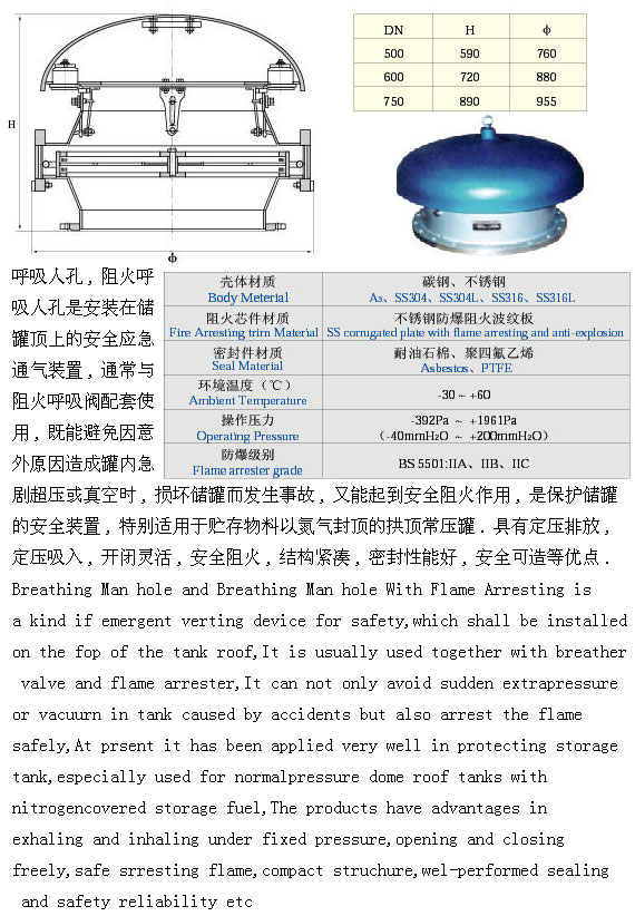 呼吸人孔(KHXF-HR),阻火呼吸人孔是安裝在儲罐頂上的安全應急勇氣裝置,通常與阻火呼吸閥配套使用,既能避免因意外原因造成罐內急劇超壓或真空時,損壞儲罐面發生事故,又能起到安全阻火作用,是保護儲罐的安全裝置,特別適用于貯存物料以氮氣封頂的拱頂常壓罐。具有定壓排放,定壓吸入,開閉靈活,安全阻火,結構緊湊,密封性好,安全可造等優點。