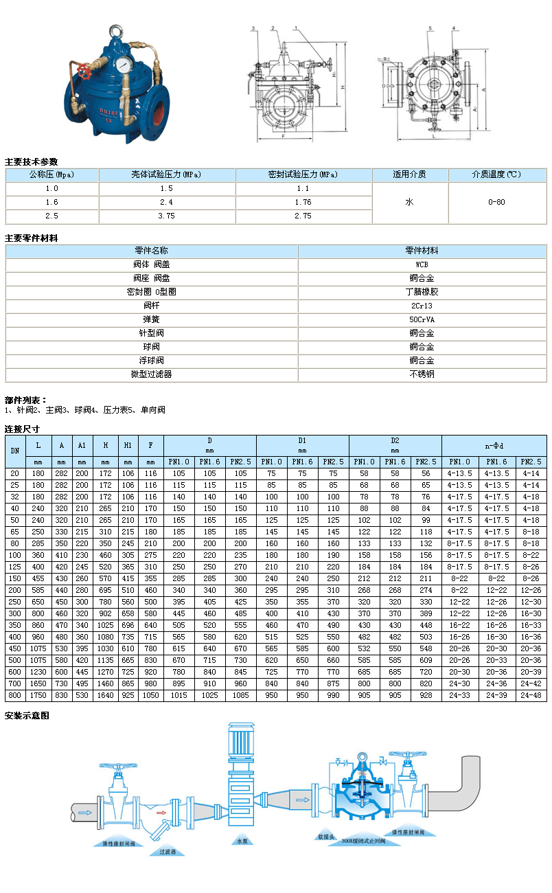 300X緩閉止回閥由主閥、單向閥、針閥、球閥、微形過濾器和壓力表組成水力控制接管系統(tǒng)。利用水力自動(dòng)操作,可使主閥得到佳的開啟或關(guān)閉速度。防止水鍾水擊的產(chǎn)生,以達(dá)到緩閉消聲的效果。本產(chǎn)品利用水力自力控制,不需要其它裝置和能源,保養(yǎng)簡(jiǎn)便,開啟及緩閉平穩(wěn)。本系列閥門產(chǎn)品廣泛用于高層建筑、生活區(qū)等供水管網(wǎng)系統(tǒng)及城市供水工程。當(dāng)閥門從進(jìn)口端給水時(shí),水通過微型過濾器、針閥、單向閥進(jìn)入主閥控制室,再經(jīng)過球閥排水至下游。因?yàn)獒橀y開度小于球閥開度,即主閥控制室的排水速度大于進(jìn)水速度,因此控制室壓力降低,作用于主閥盤下端的進(jìn)口壓力打開主閥向下游供水。當(dāng)管道停止供水時(shí),若下游水開始回流,一部分回流水經(jīng)球閥進(jìn)入主控制室,由于單向閥作用,回流水不能從主控制室流出,引起主控制室逐漸升壓,緩緩關(guān)閉主閥。
